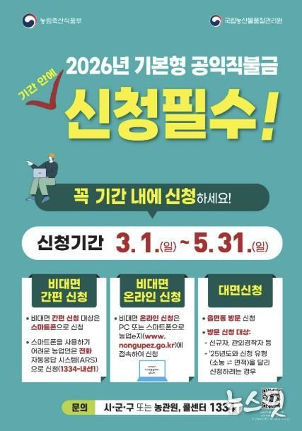 (뉴스핏 = 김호 기자) 포천시는 오는 3월 1일부터 농업의 공익적 기능을 강화하고 농업인의 소득 안정을 지원하기 위한 ‘2026년 기본형 공익직접지불금’ 신청을 받는다.
