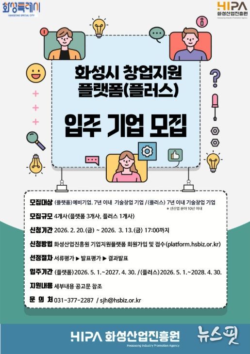 (뉴스핏 = 김수진 기자) 화성산업진흥원(원장 전병선)은 동탄2 인큐베이팅센터 내 창업보육센터 ‘창업지원플랫폼’과‘창업지원플랫폼 플러스’ 입주기업을 오는 3월 13일까지 모집한다고 밝혔다.