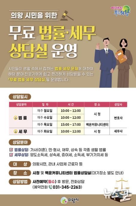 (뉴스핏 = 김수진 기자) 의왕시가 시민들의 생활 속 법률·세무 고민 해결을 위한 ‘무료 법률‧세무 상담실’을 연중 운영하고 있다.