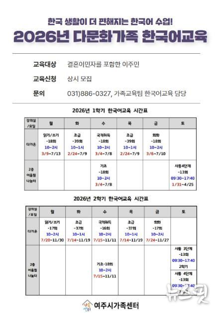 2026년 다문화가족 대상 한국어 교육은 2월부터 11월까지 연중 운영되며, 학습자 욕구에 맞춘 수준별 교육과정으로 신청이 가능하다.