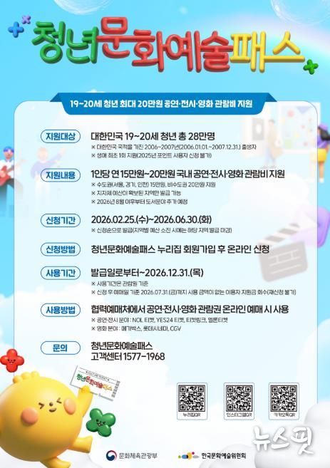 이번 사업은 사회에 첫발을 내딛는 청년들이 공연, 전시, 영화 등 다양한 문화예술을 부담 없이 즐길 수 있도록 돕기 위한 것으로, 올해는 지원 연령을 기존 만 19세에서 만 20세까지 확대해 더 많은 청년이 혜택을 받을 수 있게 됐다.