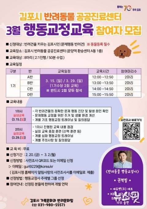 반려견의 행동 교정이 필요한 김포시민이라면 누구나 신청할 수 있으며, 사전조사를 통해 반려견의 양육환경과 문제행동 유형을 파악한 뒤 최종 교육 대상자를 선정한다. 교육 장소는 반려동물 공공진료센터(운양역환승센터 A동 1층)이다.