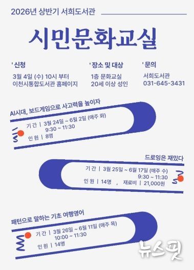 (뉴스핏 = 김수진 기자) 이천시 서희도서관이 지역 주민들의 문화적 소양을 높이고 배움의 즐거움을 나누기 위해 ‘2026년 상반기 시민문화교실’을 운영하고 성인 수강생을 모집한다고 24일 밝혔다.