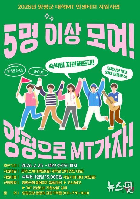 (뉴스핏 = 김호 기자) 양평군은 25일부터 관외 대학생들의 지역 방문을 유도하고 관광 활성화를 도모하기 위해 ‘2026년 양평군 대학 엠티(MT) 인센티브 지원 사업’을 본격 시행한다고 밝혔다.