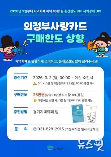 (뉴스핏 = 김수진 기자) 의정부시는 지역경제 활성화와 민생 안정을 위해 3월부터 의정부사랑카드(지역화폐) 월 구매 한도를 기존 15만 원에서 25만 원으로 상향한다.