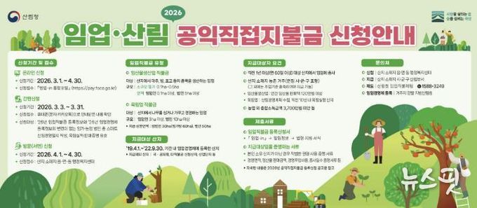(뉴스핏 = 김호 기자) 동두천시는 2026년 임업·산림 공익직접지불금 신청 접수를 3월 1일부터 4월 30일까지 실시한다.