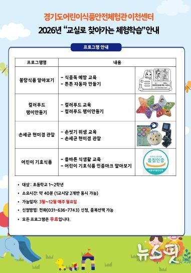 (뉴스핏 = 김수진 기자) 어린이식품안전체험관 이천센터에서는 3월부터 12월까지 관내 초등 새내기 및 저학년 어린이들을 대상으로 ‘교실로 찾아가는 체험학습’ 프로그램을 진행한다.
