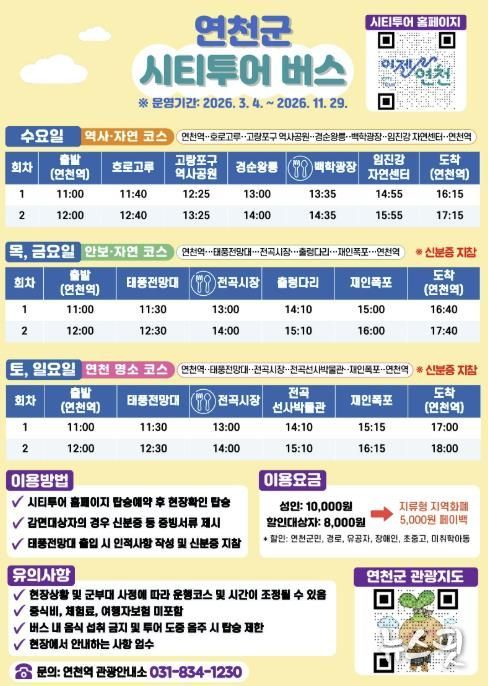 (뉴스핏 = 김호 기자) 연천군이 오는 3월 4일부터 ‘2026년 연천 시티투어 버스’를 재운행한다. 운영 기간은 11월 29일까지다.