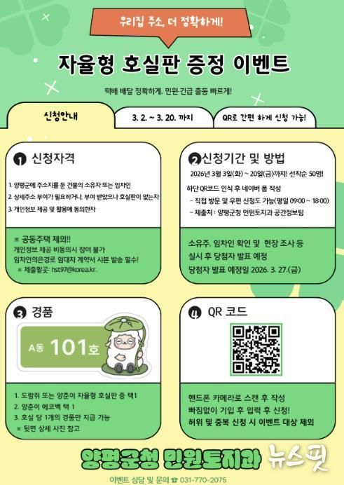 또한, 군민 참여 확대를 위해 ‘자율형 호실판 증정 이벤트’도 병행 추진한다. 이벤트는 3월 3일부터 3월 20일까지 온라인 설문 방식으로 진행되며, 상세주소 부여가 필요한 양평군민을 대상으로 선착순 50명에게 지자체 캐릭터를 활용한 자율형 호실판 에코백이 제공될 예정이다.