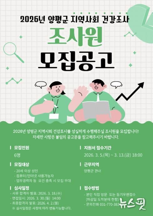(뉴스핏 = 김호 기자) 양평군은 질병관리청 및 양평군보건소와 공동으로 추진하는 ‘2026년 지역사회 건강조사’에 참여할 조사원 6명을 모집한다고 3일 밝혔다.