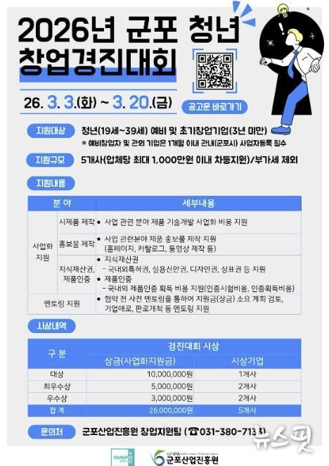(뉴스핏 = 김수진 기자) 군포산업진흥원은 지역 내 유망 청년 창업가를 발굴하고 혁신 아이디어의 성공적인 사업화를 지원하기 위해 2026년 군포 청년 창업경진대회 지원사업 참가자를 2026년 3월 3일부터 3월 20일까지 모집한다고 밝혔다.
