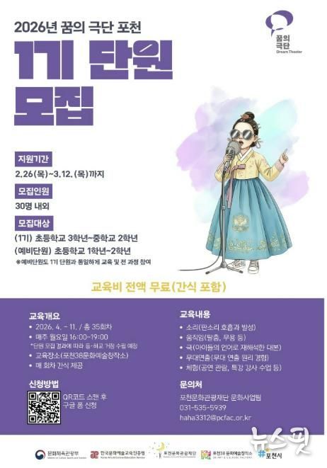 (뉴스핏 = 김호 기자) 포천문화관광재단은 지역 아동·청소년을 위한 문화예술교육 프로그램 ‘2026 꿈의 극단 포천’의 1기 신규 단원을 오는 3월 12일까지 모집한다.