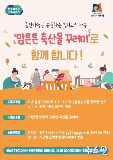 이에 따라 경기도에 주소를 두고 2026년 1월 1일~12월 31일까지 안성시에 자녀 출생신고를 마친 산모에게 1인당 10만 원 상당의 국내산 축산물 꾸러미를 지원한다.