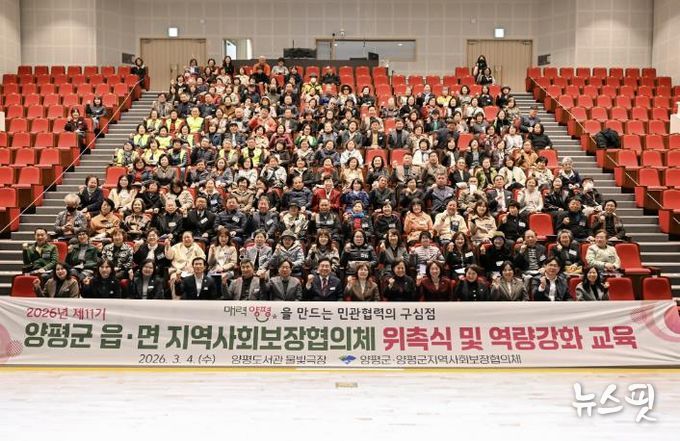 (뉴스핏 = 김호 기자) 양평군은 지난 4일 양평도서관 물빛극장에서 250여 명이 참석한 가운데 ‘2026년 제11기 읍면 지역사회보장협의체 위촉식 및 역량 강화 교육’을 개최하고, 지역 맞춤형 복지안전망 강화를 위한 본격적인 활동에 들어갔다고 밝혔다.