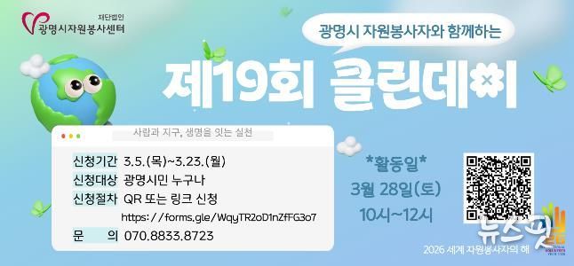 (뉴스핏 = 김호 기자) 광명시자원봉사센터는 오는 3월 28일 자원봉사 단체․활동처 및 광명 시민이 함께 광명시 전역에서 환경정화 활동을 펼치는‘제19회 광명시 자원봉사자와 함께하는 클린데이’를 진행한다고 밝혔다.