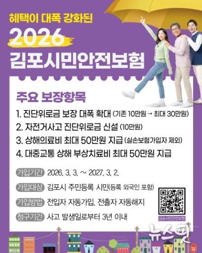 (뉴스핏 = 김호 기자) 김포시는 3일부터 시민들이 일상생활 중 겪을 수 있는 불의의 사고에 대비해 보장 항목을 강화한 ‘2026년 김포시민안전보험’을 시행한다고 5일 밝혔다.