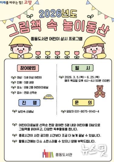 (뉴스핏 = 김수진 기자) 고양특례시 풍동도서관은 어린이 그림책 읽어주기 상시 프로그램 ‘그림책 속 놀이동산’을 운영한다고 5일 밝혔다.