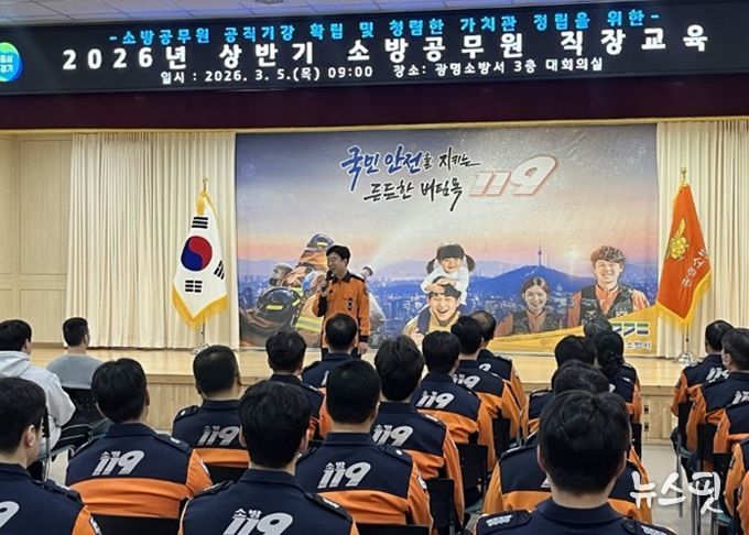 (뉴스핏 = 김수진 기자) 광명소방서는 5일 본서 3층 대회의실에서 전 직원을 대상으로 2026년 상반기 소방공무원 직장교육을 실시했다.