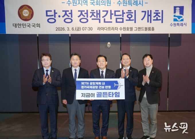 (뉴스핏 = 김호 기자) 이재준 수원특례시장은 6일 라마다프라자 수원호텔에서 열린 지역 국회의원들과 당·정 정책간담회에서 “제7차 공항개발 종합계획에 ‘경기국제공항’ 건설 내용이 반영될 수 있도록, 경기도와 협의해 달라”고 요청했다.