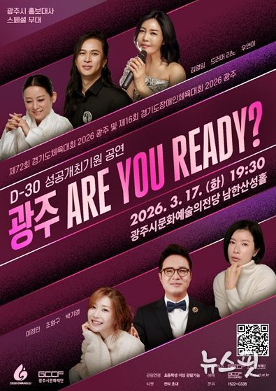 (뉴스핏 = 김수진 기자) 광주시문화재단은 오는 3월 17일 오후 7시 30분, 광주시문화예술의전당 남한산성홀에서 ‘제72회 경기도체육대회 2026 광주 및 제16회 경기도장애인체육대회 2026 광주 D-30 성공기원 공연’ '광주! ARE YOU READY?'’를 개최한다.