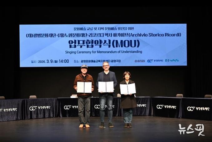 (뉴스핏 = 김호 기자) (재)광명문화재단은 3월 9일 오후 2시 광명극장에서 (재)노원문화재단, 리코르디 역사 아카이브(Archivio Storico Ricordi)(이하 리코르디)와 ‘문화예술 교류 및 지역 문화예술 발전’을 위한 업무협약(MOU)을 체결했다고 밝혔다.