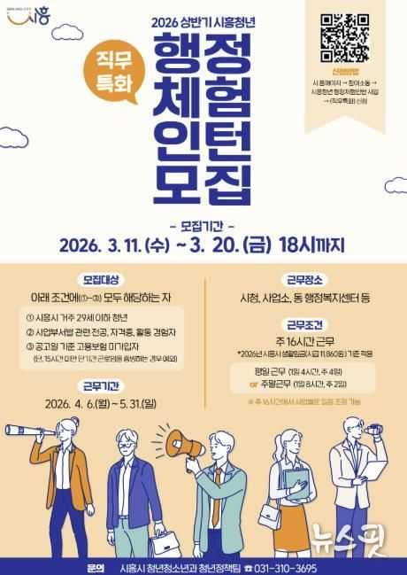 (뉴스핏 = 김수진 기자) 시흥시는 지역 청년들의 실질적인 일 경험과 진로 탐색을 지원하기 위해 ‘2026년 (직무특화) 상반기 행정체험 인턴 사업’을 운영하고, 11~20일까지 참여 청년 10명을 모집한다고 밝혔다.