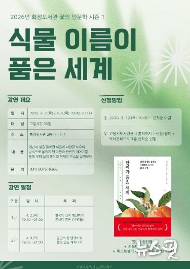 (뉴스핏 = 김수진 기자) 고양특례시 화정도서관은 오는 4월 2일과 4월 9일 오후 7시 30분, 두 차례에 걸쳐 꽃 인문학 시즌1 강연‘식물 이름이 품은 세계’을 운영한다.