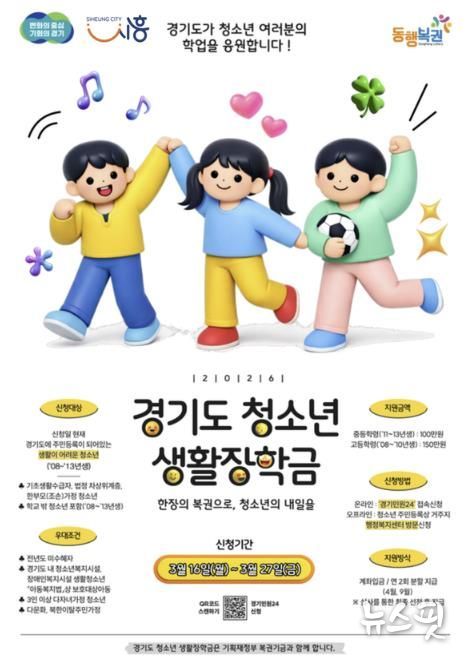 (뉴스핏 = 김수진 기자) 시흥시는 경제적 어려움을 겪는 청소년들이 안정적으로 학업을 이어갈 수 있도록 지원하는 ‘청소년 생활장학금’ 대상자를 16일부터 27일까지 모집한다고 밝혔다.