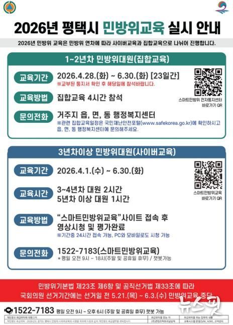 (뉴스핏 = 김수진 기자) 평택시는 올해는 4월 28일부터 6월 30일까지 민방위 대원 1~2년 차를 비롯해 기술지원대, 지역민방위대장 교육을 집합교육(기본교육)으로 실시하고, 3년 차 이상 대원은 4월 1일부터 6월 30일까지 사이버교육을 실시하며, 선거기간(2026.5.21. ~ 6.3.)에는 민방위 교육훈련을 금지한다고 밝혔다.