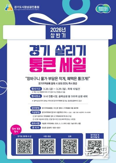 (뉴스핏 = 김수진 기자) 경기도시장상권진흥원은 ‘2026년 상반기 경기 살리기 통큰 세일’이 오는 20일부터 29일까지 10일간 도내 전통시장과 골목상권 등 500여 곳에서 열린다고 밝혔다.