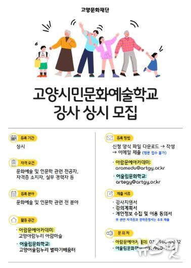 (뉴스핏 = 김수진 기자) 고양문화재단은 시민들에게 참신하고 수준 높은 문화예술교육 서비스를 제공하기 위해 ‘고양시민문화예술학교’(아람문예아카데미 및 어울림문화학교) 강사 인력풀(POOL)을 상시 모집한다.