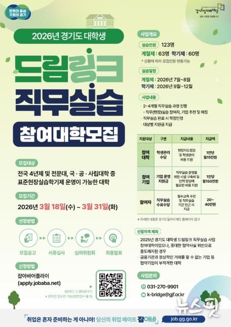 (뉴스핏 = 김수진 기자) 경기도와 경기도일자리재단이 ‘경기도 대학생 드림링크 직무실습’ 사업에 참여할 15개 협력대학을 31일까지 모집한다.