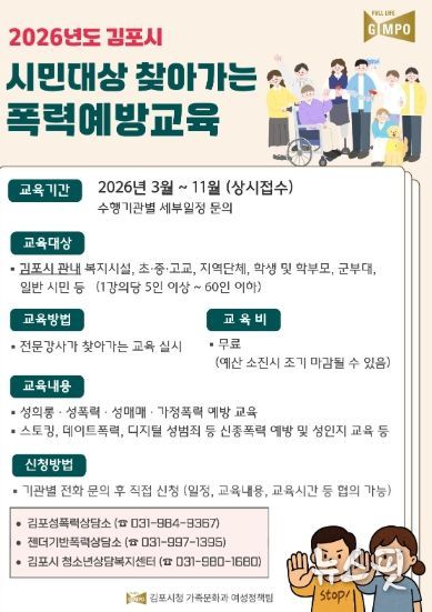 (뉴스핏 = 김호 기자) 김포시는 시민의 건전한 성 가치관 형성과 폭력 예방 의식 확산을 위해 ‘2026년 김포시 시민대상 폭력예방교육’ 사업을 3월부터 11월까지 추진한다고 밝혔다.