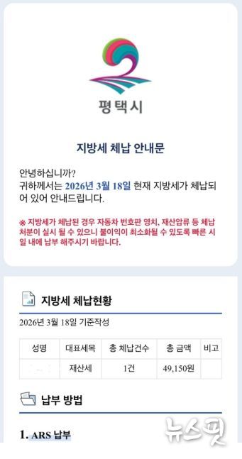 (뉴스핏 = 김수진 기자) 평택시는 ‘모바일 전자고지 시스템’을 활용해 지방세 체납자 1만7천여 명을 대상으로 오는 23일과 24일 이틀 동안 전자문서 형태의 체납안내문을 발송할 예정이다.