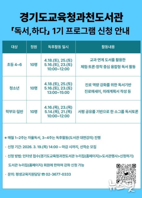 (뉴스핏 = 김수진 기자) 경기도교육청과천도서관이 지역주민의 독서 역량 강화와 융합적 사고력 함양을 위해 '2026년 독서, 하다’프로그램을 운영한다.