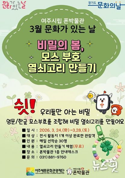 (뉴스핏 = 김수진 기자) 여주세종문화관광재단이 운영하는 여주시립 폰박물관은 3월 '문화가 있는 날'을 맞아 오는 24일부터 28일까지 5일간 시민 참여형 행사 ‘비밀의 봄, 모스부호 열쇠고리 만들기’를 운영한다고 19일 밝혔다.