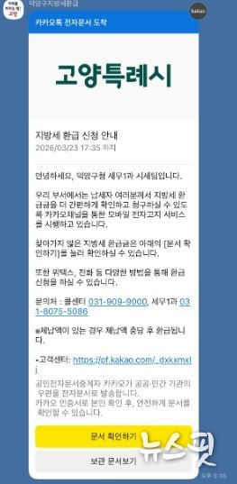 (뉴스핏 = 김호 기자) 고양특례시 덕양구는 23일 오늘 지방세 환급금을 수령하지 않은 납세자를 대상으로 카카오 알림톡(채널명: 덕양구지방세환급)을 발송해 환급금 조회 및 신청 방법을 안내할 예정이다.