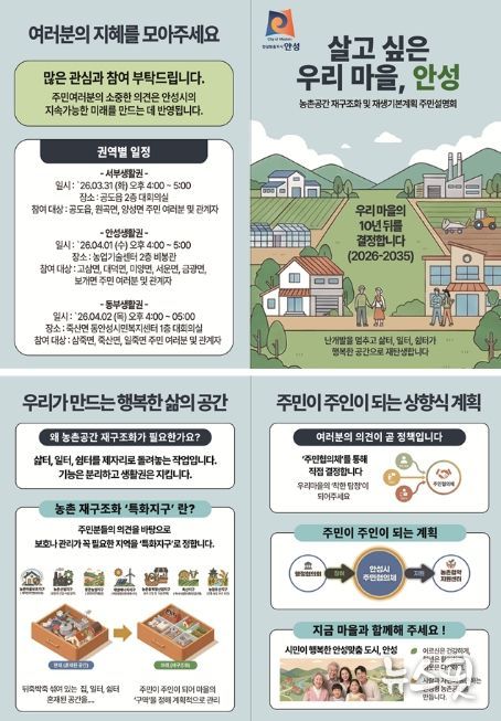 (뉴스핏 = 김수진 기자) 안성시는 농촌 지역의 체계적인 정비와 지속 가능한 발전을 위한 ‘농촌공간 재구조화 및 재생 기본계획’ 수립과 관련하여, 지역 주민의 생생한 목소리를 듣기 위한 주민설명회를 개최한다고 밝혔다.