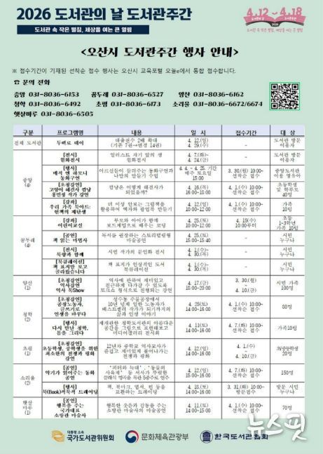 (뉴스핏 = 김수진 기자) 오산시는 2026년 도서관의 날(4월 12일)과 도서관주간(4월 12일~4월 18일)을 맞아 시민 누구나 참여할 수 있는 다양한 독서문화 행사를 운영한다고 밝혔다.