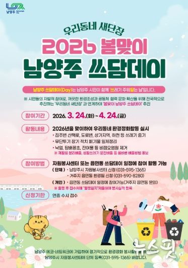 (뉴스핏 = 김호 기자) 남양주시는 3월 24일부터 4월 24일까지 시 전역에서‘우리동네 새단장 봄맞이 남양주 쓰담데이’집중 추진기간을 운영한다고 밝혔다.