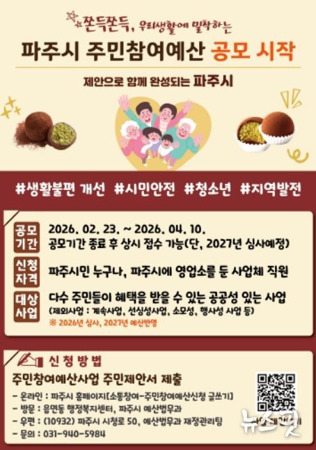 (뉴스핏 = 김호 기자) 파주시는 2027년도 예산 편성에 반영할 주민참여예산 시민 제안을 오는 4월 10일까지 접수한다.
