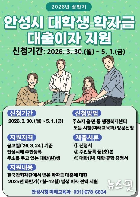 (뉴스핏 = 김수진 기자) 안성시는 대학생 및 대학원생들의 교육비 부담을 덜어주기 위해 ‘2026년 상반기 대학생 학자금 대출이자 지원사업’을 시행한다고 밝혔다.