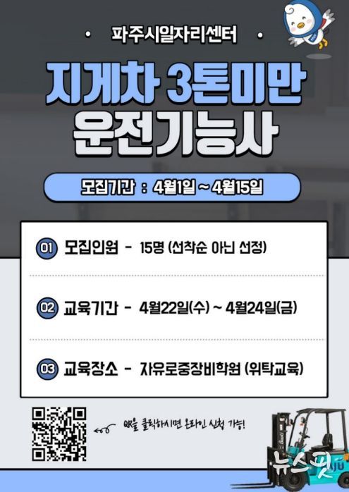 (뉴스핏 = 김호 기자) 파주시는 4월 1일부터 4월 15일까지 관내에 거주하는 중장년층 구직자를 대상으로 ‘지게차(3톤 미만) 운전기능사’취업지원 프로그램 참여자 15명을 모집한다고 밝혔다.