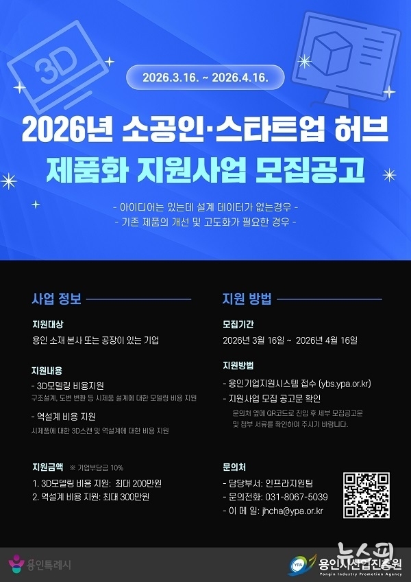 (뉴스핏 = 김수진 기자) 용인시산업진흥원(이하 진흥원)은 용인시 관내 소공인 및 스타트업의 제품 개발을 촉진하고 초기 제품의 시장 경쟁력을 강화하기 위해 '2026년 소공인·스타트업 허브 제품화 지원사업’ 참여기업을 모집한다고 2일 밝혔다.