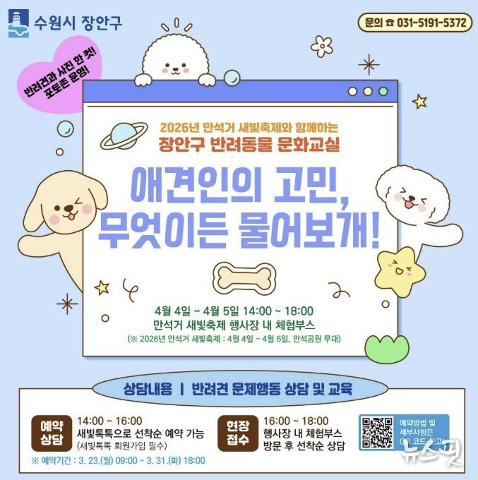 (뉴스핏 = 김호 기자) 수원시 장안구가 4월 4일부터 5일까지 장안구 만석공원 내 체험부스에서 시민들을 대상으로 반려동물 문화교실을 추진한다.