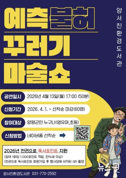 대표 프로그램인 ‘예측불허 꾸러기 마술쇼’는 오는 4월 13일 오후 5시에 개최된다. ‘매직유랑단’이 진행하는 이번 공연은 관객 참여형 마술 체험으로 구성돼 어린이들의 상상력을 자극할 것으로 기대된다. 모집 대상은 보호자를 동반한 관내 영유아 및 초등학생이며, 4월 1일부터 온라인 신청(네이버 폼)을 통해 선착순 60명을 모집한다. 참여자에게는 ‘천권으로 독서 포인트’ 1,000점이 적립된다.
