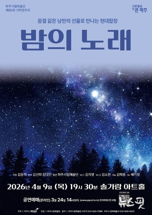 (뉴스핏 = 김수진 기자) 파주시는 파주시립예술단 제85회 기획공연 '밤의 노래'을 오는 4월 9일 19시 30분 솔가람아트홀에서 개최한다.