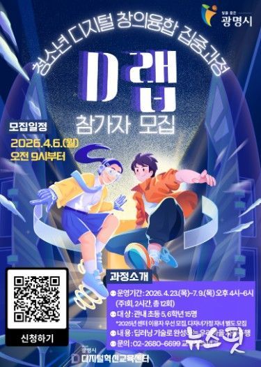 (뉴스핏 = 김호 기자) 광명시 디지털혁신교육센터가 지역 청소년들의 디지털 창의성과 인공지능(AI) 역량을 강화하기 위한 장기 교육 과정인 ‘2026 청소년 디지털 창의융합 집중과정 디(D)랩’ 참가자를 모집한다.