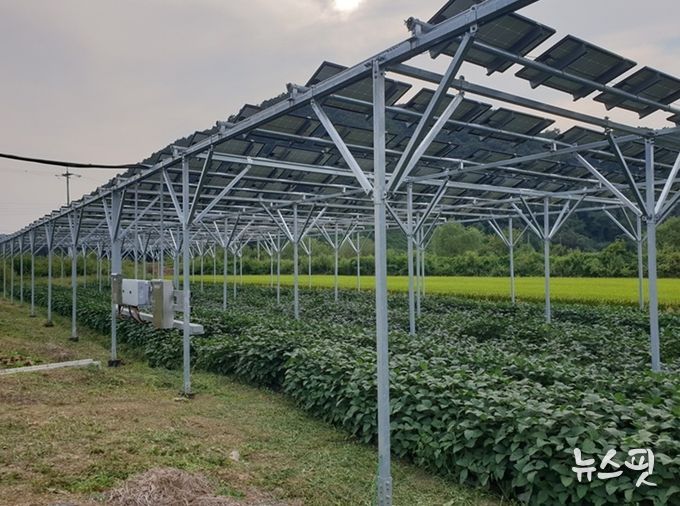 ‘영농형 태양광’은 농지 위에서는 태양광 발전을 통해 전력을 생산하고, 아래에서는 기존대로 농작물을 재배하는 방식으로, 농지의 효율적 활용을 통한 농가 소득 증대 대안으로 주목받고 있다.