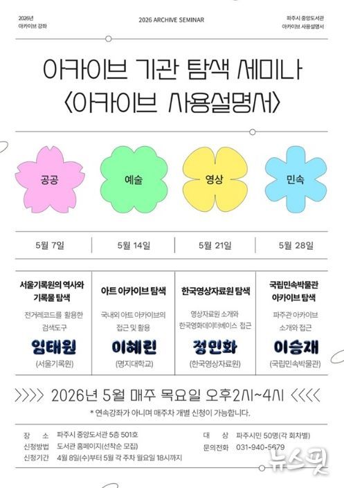 (뉴스핏 = 김호 기자) 파주시 중앙도서관은 오는 5월 7일부터 5월 28일까지 매주 목요일 중앙도서관 501호에서 기록보관기관 탐색 강좌 ‘아카이브 사용설명서’를 운영한다.
